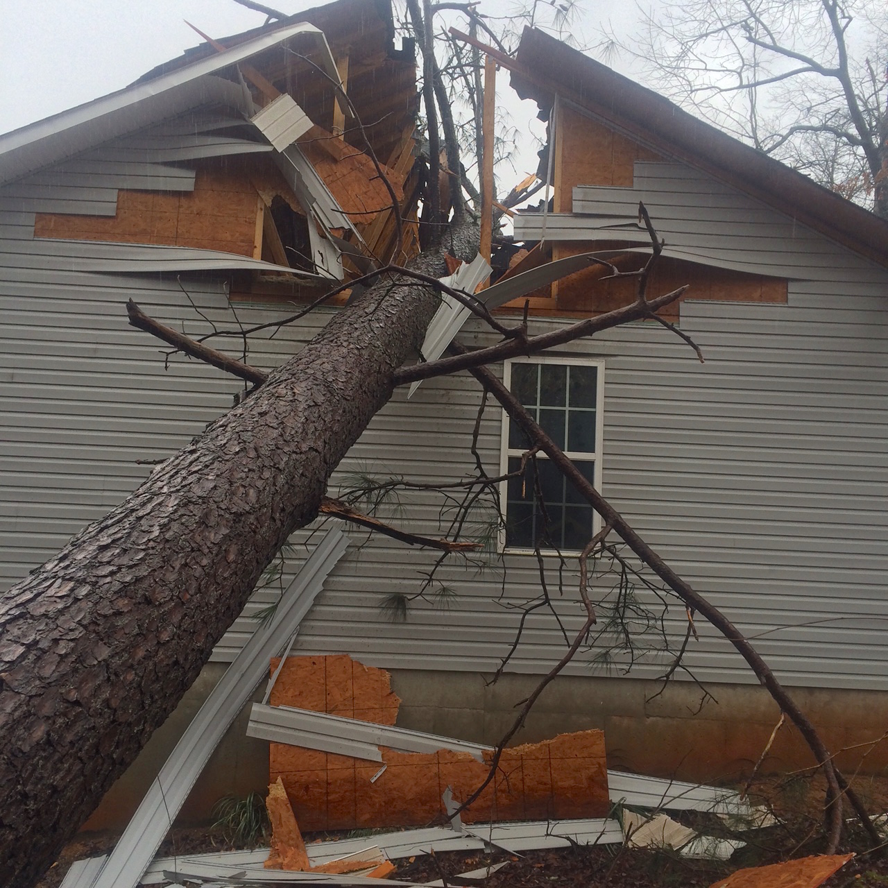 Some Clarkesville residents narrowly escaped injury this morning when a tree sliced through the roof of their house on View Street. It happened just before 8 a.m. Wednesday as strong winds and heavy rains swept through the city.