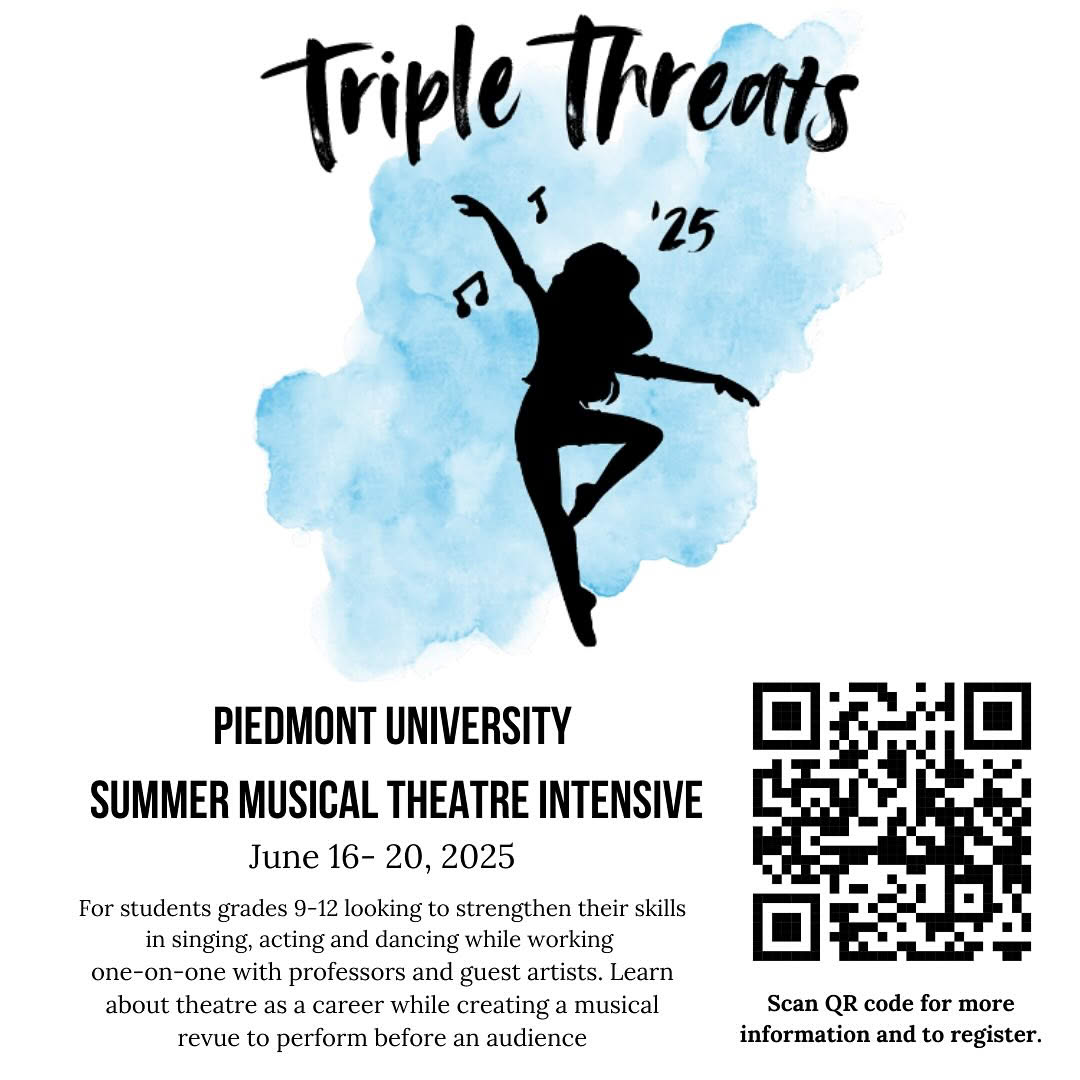 DEMOREST, GA – Aspiring performers can experience the excitement of musical theatre this summer at Piedmont University’s “Triple Threats Intensive Workshop.” Designed for students aged 14-18, the workshop runs June 16-20, 2025, from 9 A.M. to 5 P.M. daily at the Swanson Center for Performing Arts and Communications on the Piedmont University campus in Demorest, GA.