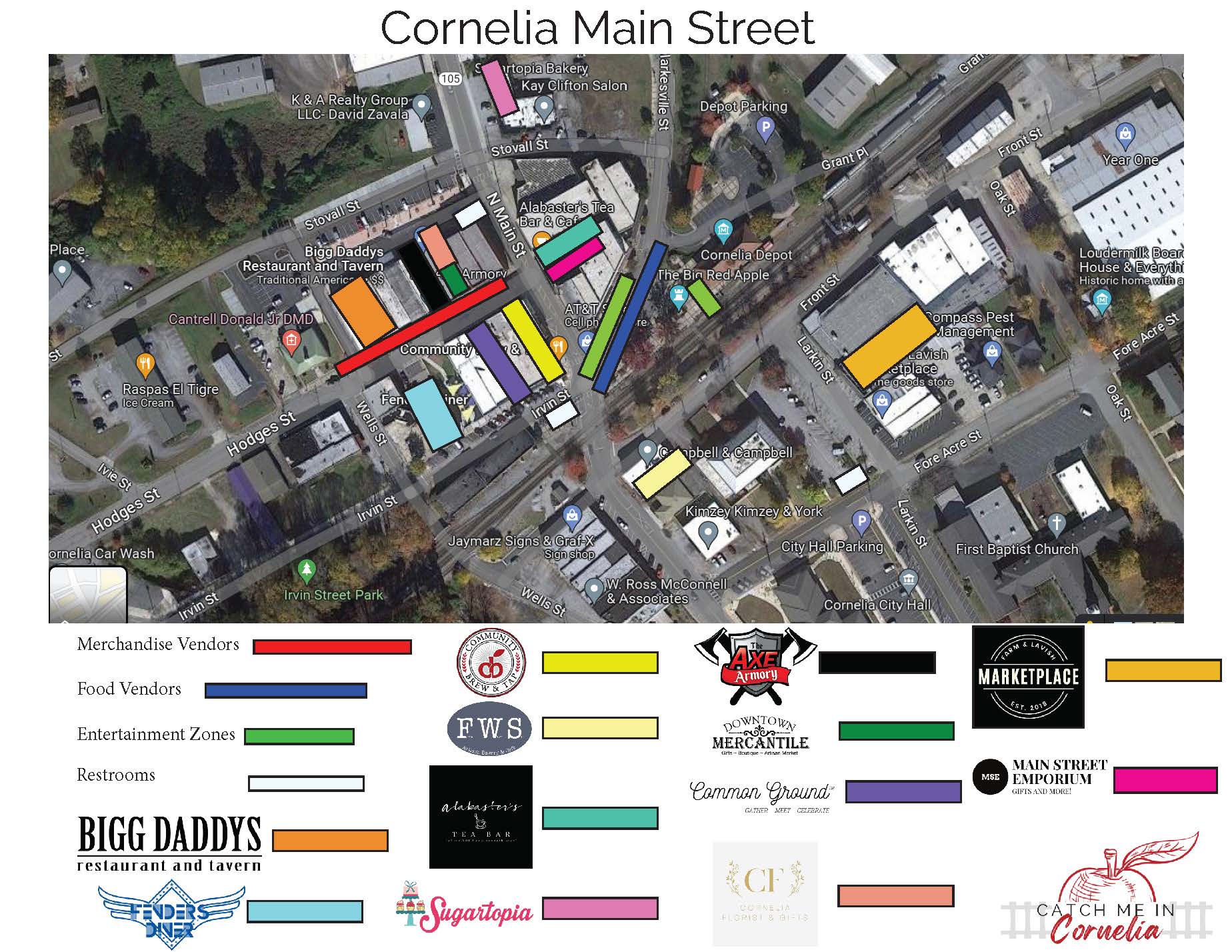Around 50 vendors will be set up in the downtown district. There will be food trucks and entertainment near the historic Cornelia depot on Clarkesville Street and merchandise vendors along Hodges Street. Downtown stores and restaurants will be open late.