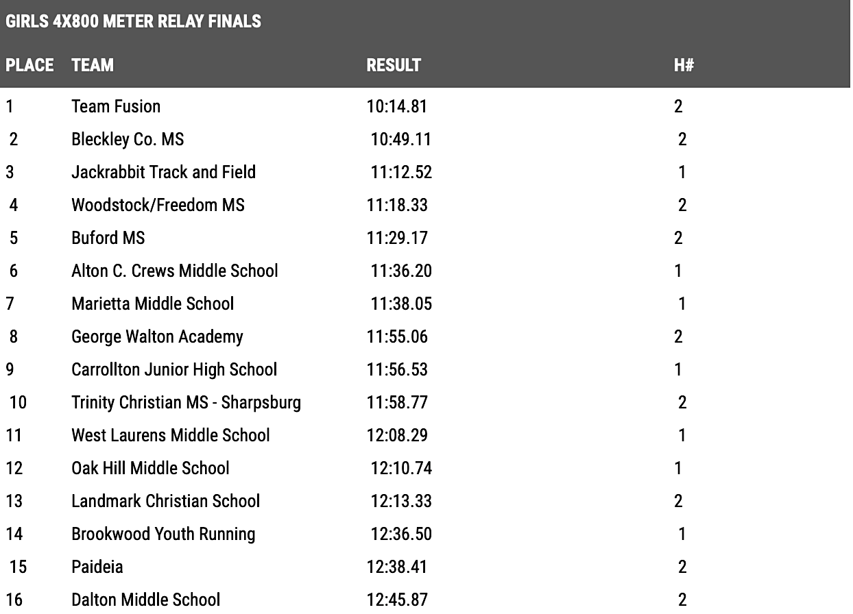 The 4X800 meter relay team of Abigail and Audrey Hotard, Megan Hightower, and Ansley Moore won the state championship by a full 35 seconds with a time of 10:14.