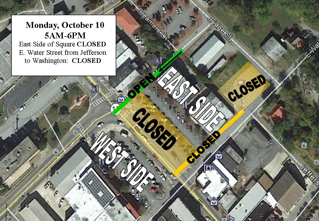 The east side of the downtown Clarkesville square parking lot will be closed on Monday, October 10th as construction crews will be bringing large concrete slabs to construct the Clarkesville plaza.