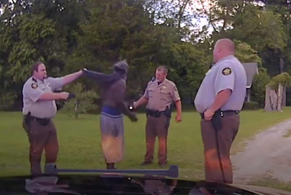 Rhett Scott, left, lifts Eurie Martin's shirt in order to get skin-only Taser contact as Henry Lee Copeland, center right, and Michael Howell talk to Martin during the 2017 encounter where Martin died. The three former deputies now face murder charges.