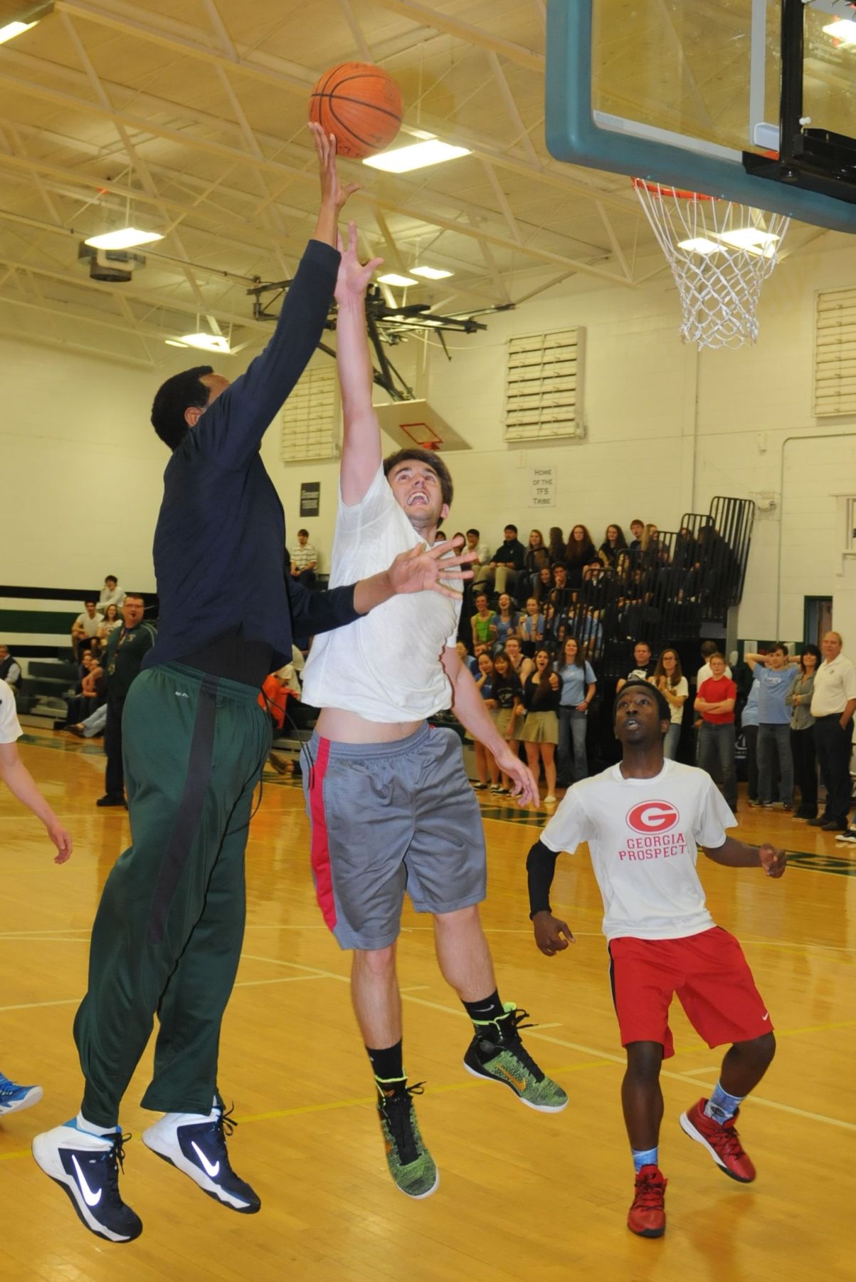TFS senior Eli Keene of Demorest stretches to block a shot by TFS assistant athletic director and coach Lowell Hamilton. Also shown is senior Emmanuel Cureton of Timberlake, N.C.