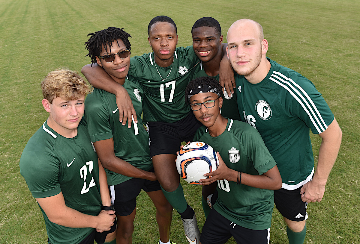 Shown, from left, are Samuel Dunlap of Lakemont, David Woods of Miami, Babatomiwa Sofela of Nigeria, Mohammad Kanu of Decatur and Daniel Kasas of Serbia. Front, Maik Murenzi of Rwanda. These six seniors completed their high school soccer careers with a 4-2 rout of Brandon Hall on Senior Day. (photo/TFS)