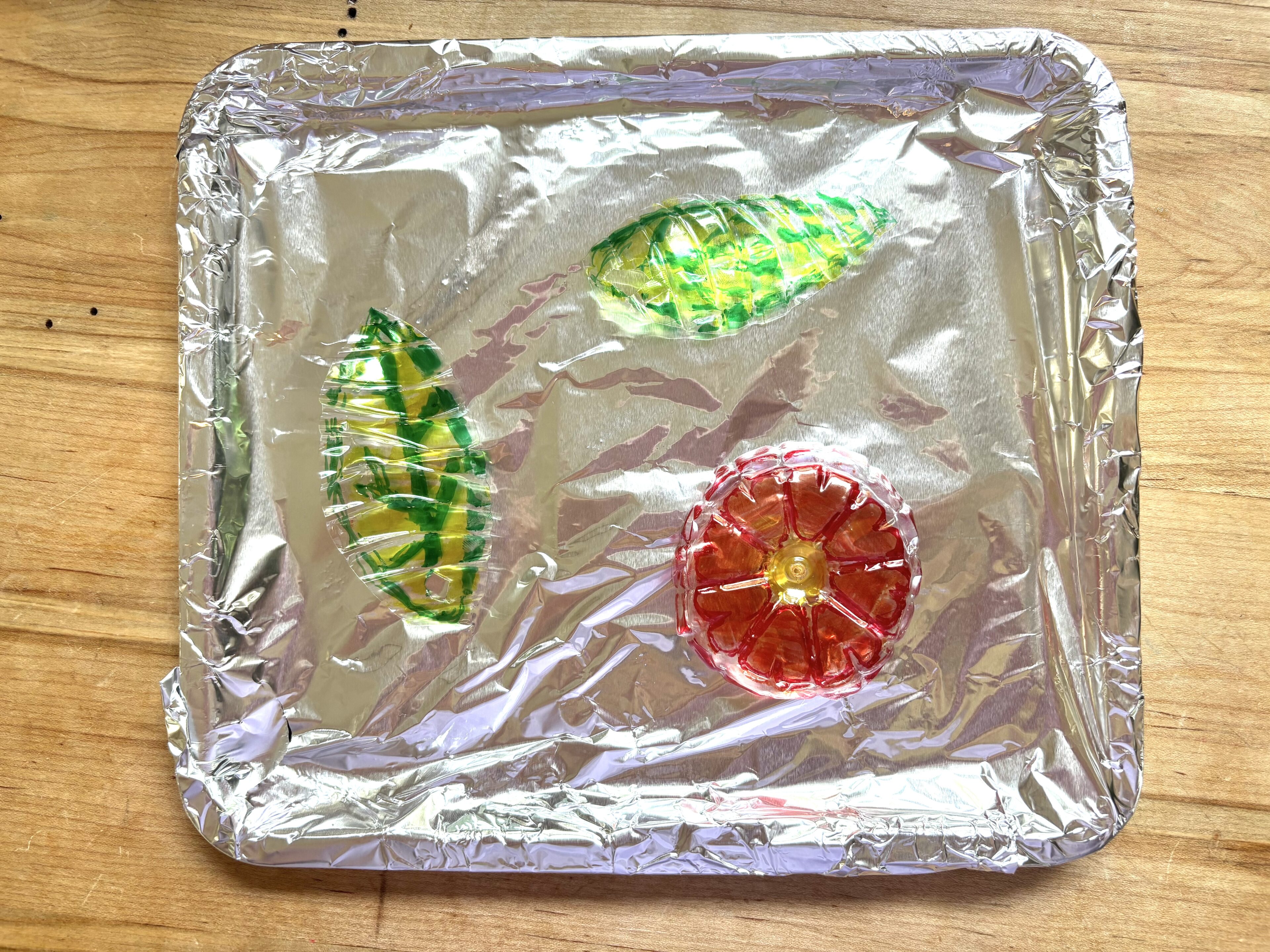 4. Preheat the oven to 350° – NOTE: Melting plastic can create fumes, so make sure you do this in a well-ventilated area. You can wear a mask for extra protection.