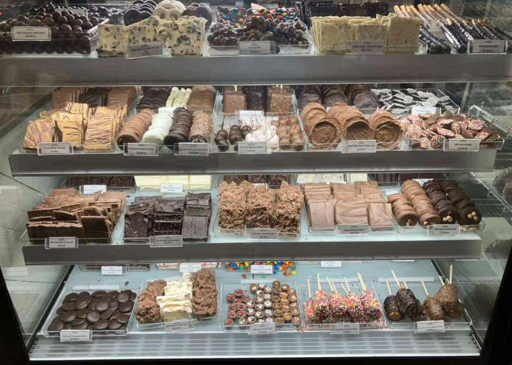 A copper kettle glows behind the counter as caramel reaches its finish, and he tempers chocolate by hand. “Sugar, butter, and cream form the base,” he explains. From those ingredients, he crafts brittle, fudge, caramel corn, syrups, and chocolates.