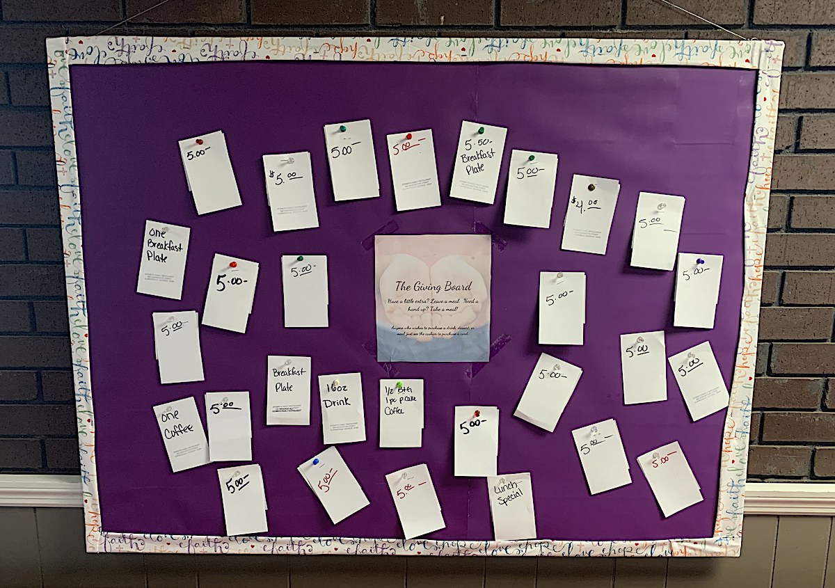 With The Giving Board, anyone in the community may donate food or money to go towards a meal. Employees tack a card to the board noting their donation. Other customers are then welcome to pull off the card and redeem it at the register for the amount or item listed.