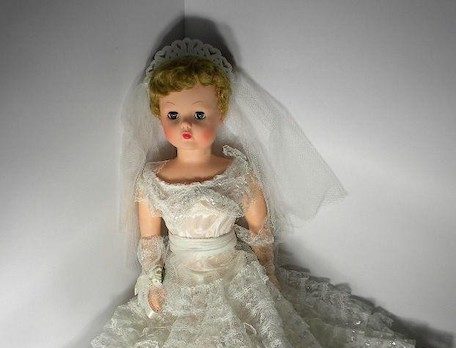 She was dressed in a white bridal gown with a veil attached to a tiara resting on her blond curls. She was about as tall as I was and the most gorgeous doll I had ever seen. Everyone appeared surprised, but my smiling grandfather had a special twinkle in his eyes.