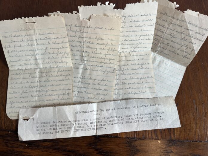 Her valedictory speech was among high school report cards and newspaper clippings. When I picked up the worn papers, one typewritten note fell to the floor; it looked as if she had cut it out of a booklet. Perhaps she used it in her speech, but the words were vitally important.