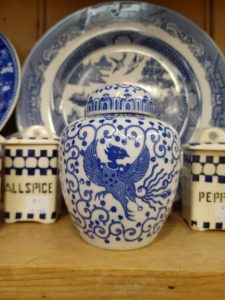 But wait – there’s more! While in this small back room, I spotted a sign that said, “More This Way.” It directed me through a crooked little hallway that spilled out into another large room! This room held a lot of clothes, but also a fair amount of housewares. I was delighted to discover a blue and white ginger jar in perfect condition. It still retained part of the blue “Made in Japan” label. This means the piece is probably a few decades old. Blue and white ginger jars always sell for me, so I snapped it up at $4 and will probably sell it for $18.
