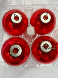 I collect vintage glass ornaments all year long and set them aside until it is time to stock the shop for Christmas. Once I’ve accumulated 12 ornaments this size, I package them in clear egg cartons and sell them for about $25 – $30 a dozen. So I was thrilled to find this third of a dozen in the closet-like room.