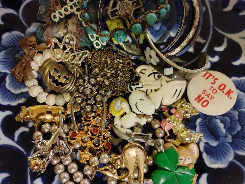 Community Thrift has carts for your shopping convenience, so when my cart was loaded, I headed to the checkout. It took the cashiers a while to check me out because I had discovered so much great merch. Then, AFTER I paid, I noticed two important signs. One announced half-priced jewelry. The other, half-priced items in the glass case. By then, the line behind me was quite long. (Due to the aforementioned quantities of great merch!) It was also right in front of all the sale items in the glass case!