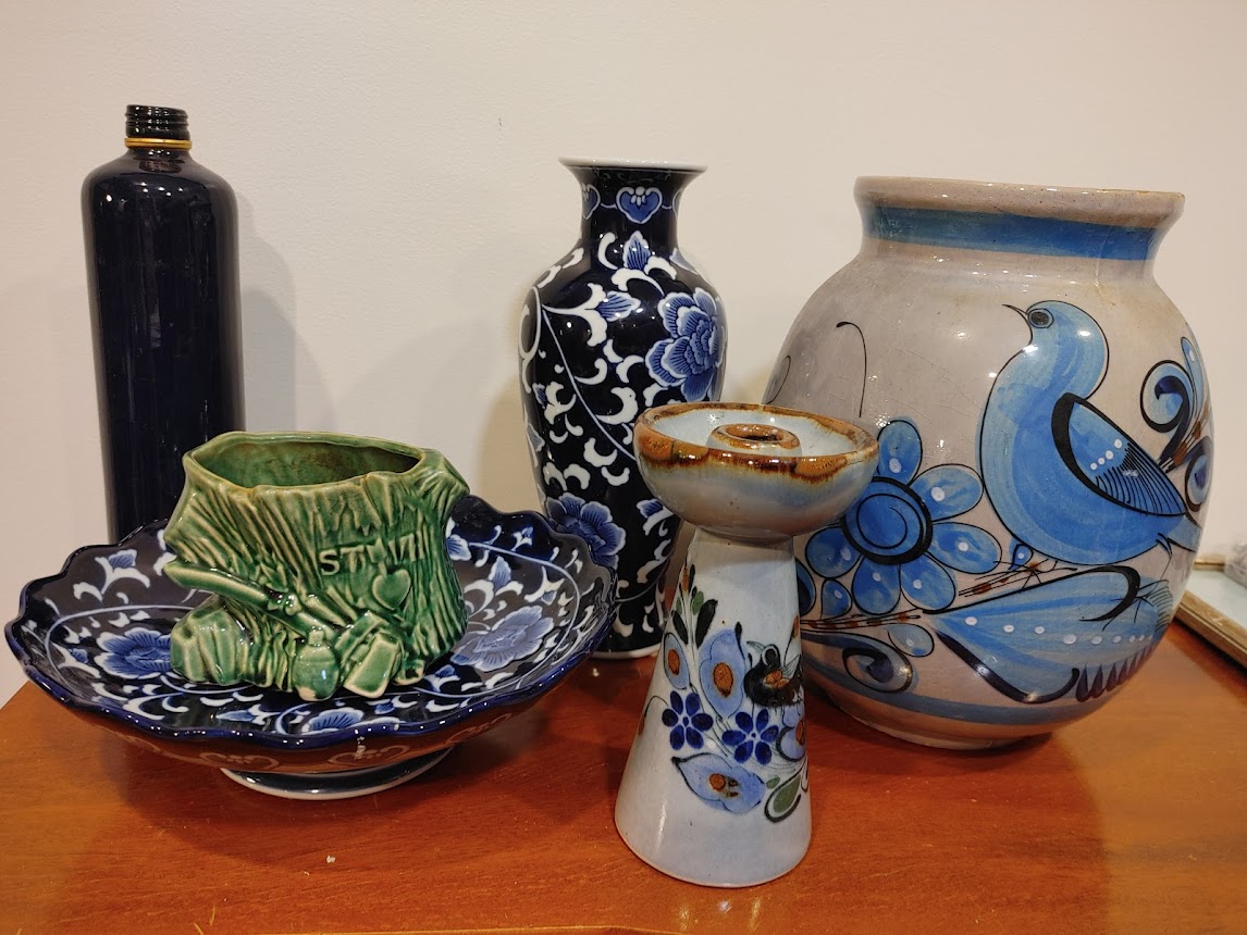 But the most exciting things I found were on the loot-laden shelves in the main building. Like the bays in the outside storage unit, these shelves were organized by category. I was immediately drawn to the pottery section, where I picked up a few pieces of blue and white pottery, which always sells well for me, along with some beautiful Tonala pottery from Mexico. (The large bird vase pictured below sold in my shop about an hour after I put it out.)