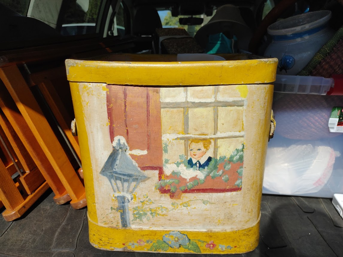 Based on the painting style, I am guessing this piece is from the 1940s, and I also think it is most likely from Great Britain. And it’s yellow. Definitely yellow. But I can’t tell you much else about it, and so far, neither can any of my resources. One friend suggested it is a firewood bin. If you happen to know what it is, let me know!