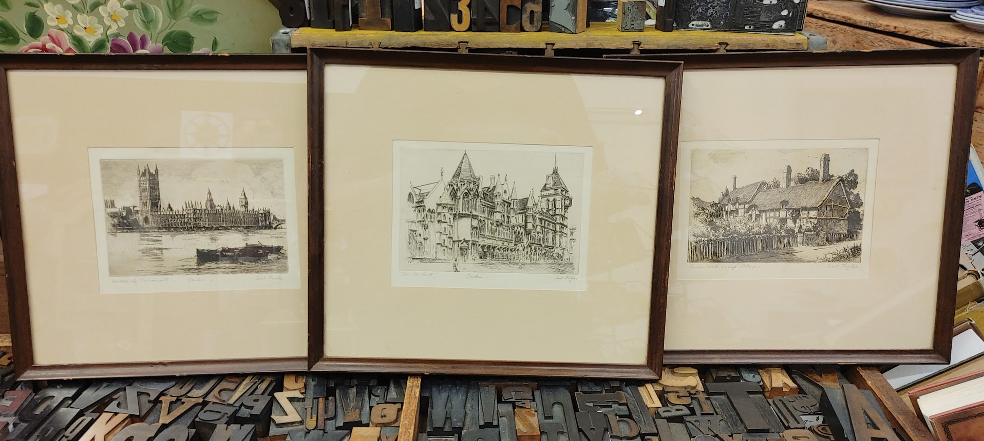 In addition to lamps, all framed art was on sale for $5! I was thrilled to find three original British etchings in beautiful shape in the art bin. My customers love etchings, and these three, valued at around $40 each, won’t last long in my shop.