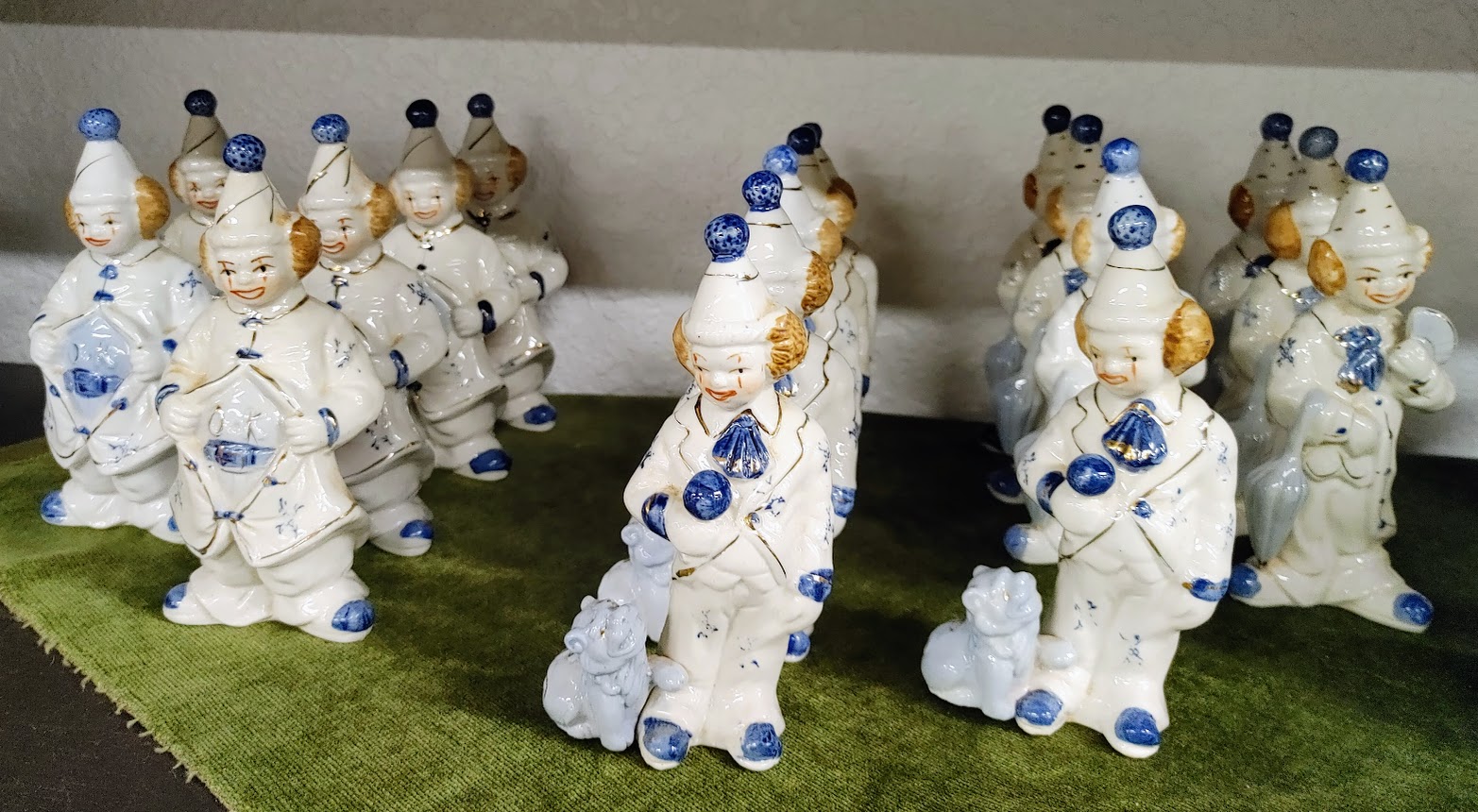 One of the joys of thrifting is finding the unexpected, and I found that at the ReStore in Clayton too! After all, who could anticipate seeing an army of vintage clown figurines? These might be the oddest I’ve ever seen; one is even holding open his jacket to show off the letters O.K. Yet somehow, OK does not come to mind when looking at his pose.