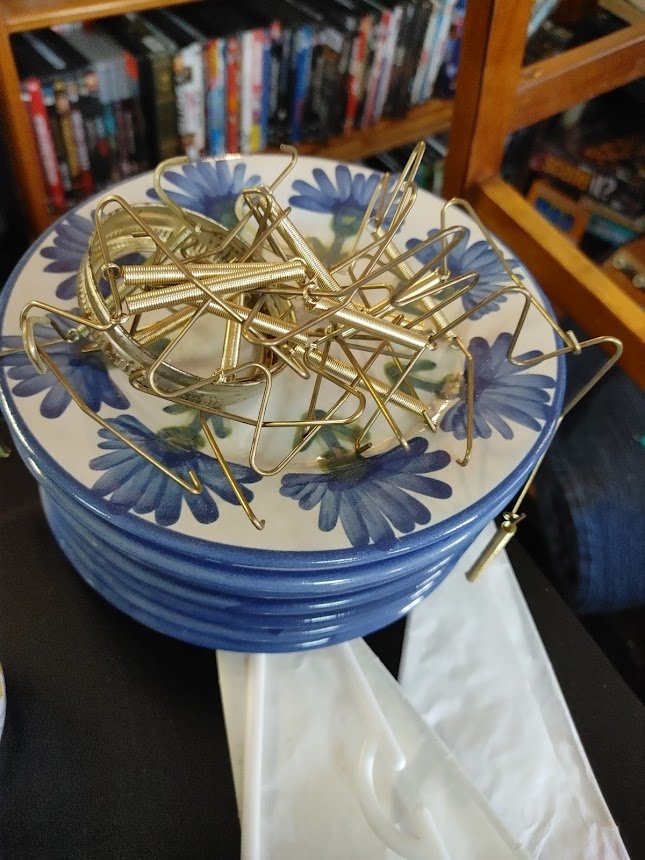 I ended up purchasing three vintage ginger jars for $1 to $2 each, a handful of plate racks for $1, some brass ship bookends for $3, and a couple of other items.