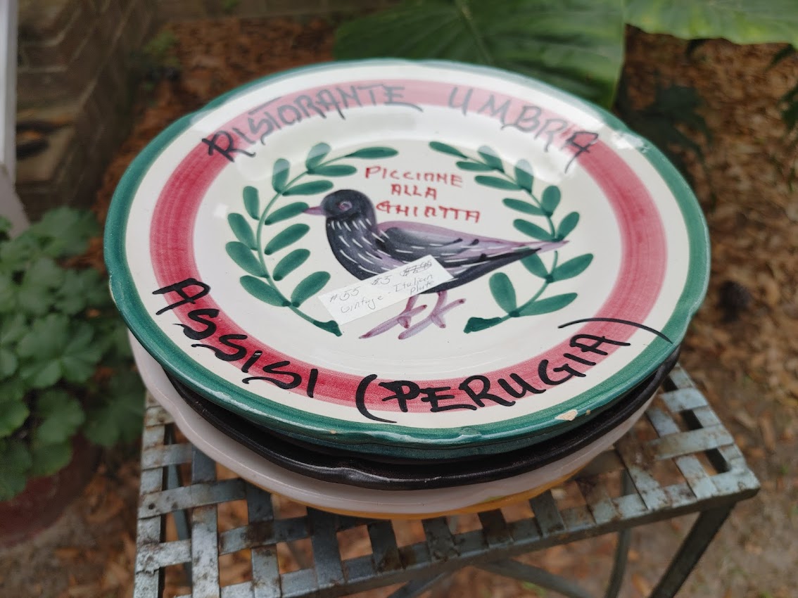 Downstairs, I found some colorful hand-painted Italian restaurant plates. These happened to be from the booth of a vendor who was there. She offered them to me for $3 each if I purchased the whole stack. Done!