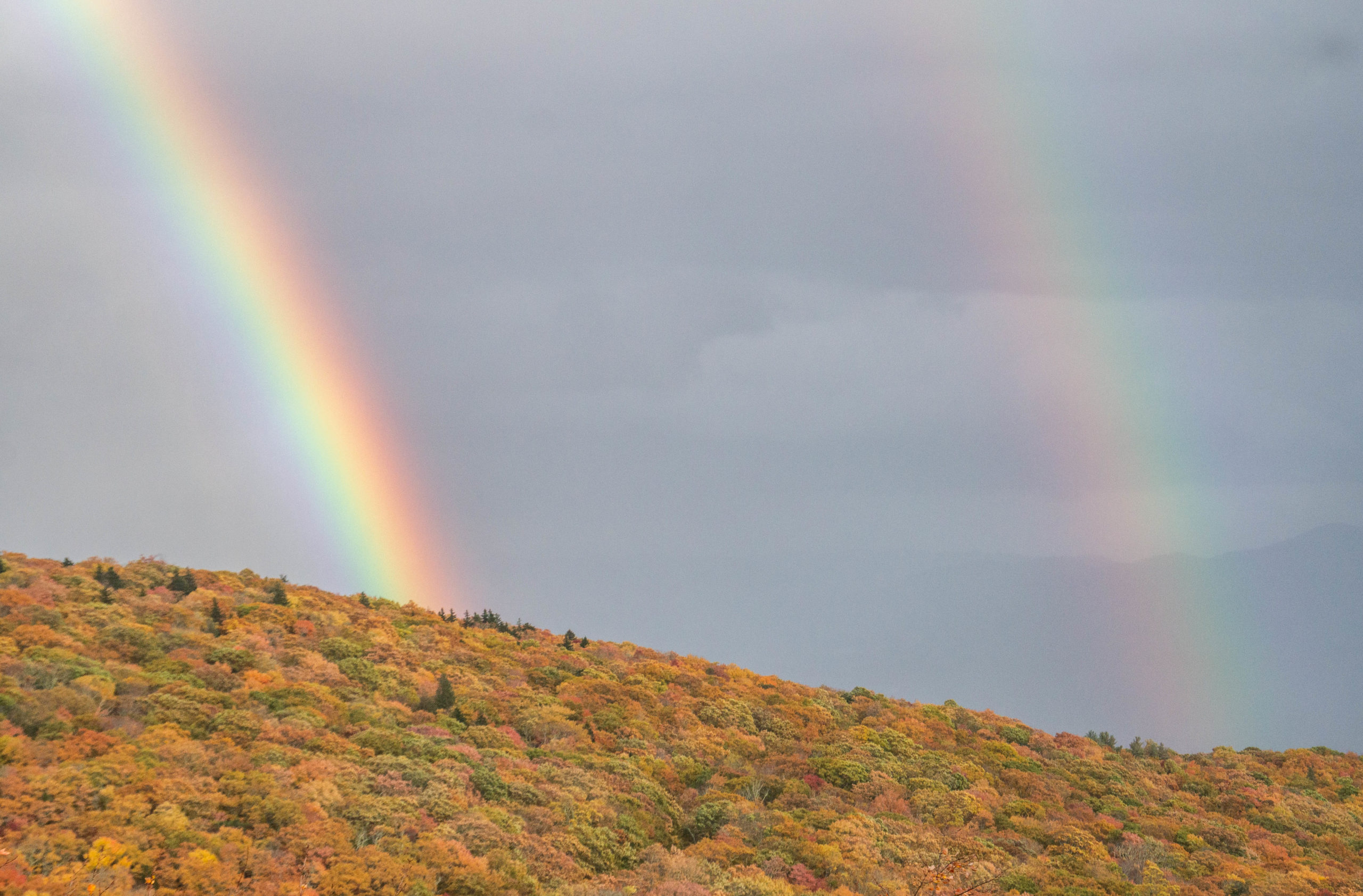 Rainbows: Everyone has seen one, and likely taken pictures of them. Personally I have spent many hours driving up and down the Blue Ridge Parkway of North Carolina hunting for rainbows in all seasons. They are caused by the sun shining through water droplets as they fall from clouds. Rainbows always occur either early or later in the day when the sun is low on the horizon and they are always opposite the sun. The water droplets reflect the sunlight and act as a prism that separates the white sunlight into its individual colors. Red on the outside followed by orange, yellow, green, blue, indigo and violet (ROY G BIV). With bright enough sunlight a secondary bow can form, what we call a double rainbow. This is a reflection of the primary rainbow and thus it appears “backwards” with red on the inside and violet on the outside. And, if you’ve ever noticed that the inside part of a rainbow is brighter than the outside you are right! The light reflects towards the “center” of the rainbow making it appear brighter.