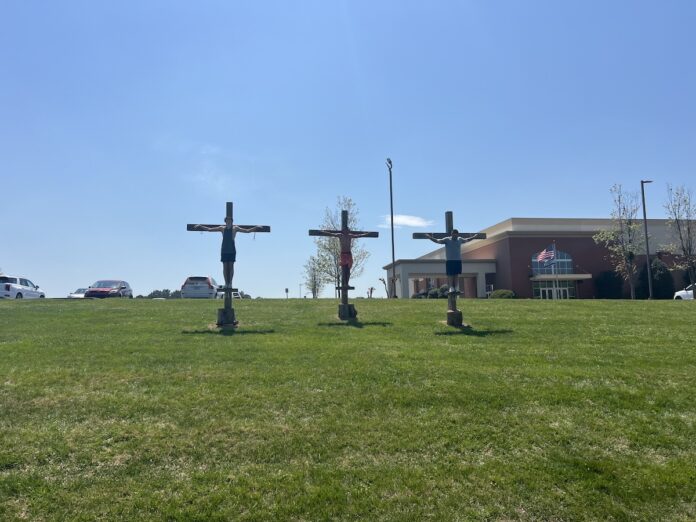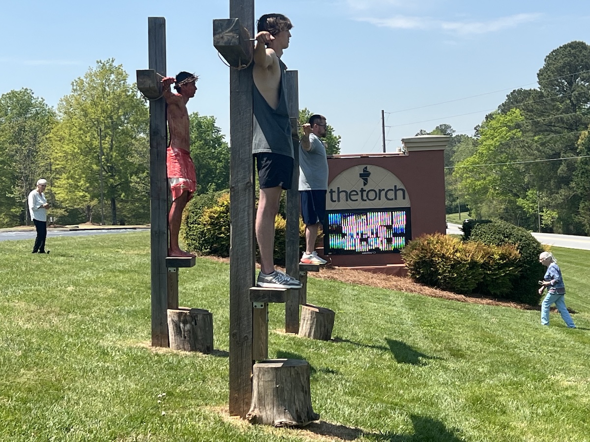 At the center of the display are three life-sized crosses, positioned prominently on church grounds, facing toward traffic so that passersby can see. Each cross represents a different part of the Good Friday narrative: the cross of rebellion, the cross of repentance, and the cross of redemption. Many drivers passed by the scene on Cannon Bridge Road, while others stopped to take it all in.