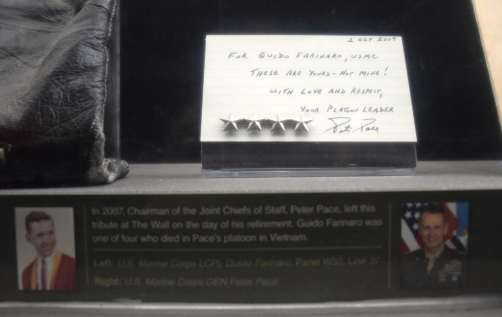 Chairman of the Joint Chiefs of Staff General Peter Pace retired on October 1, 2007. After leaving his retirement ceremony, he visited the Vietnam War Memorial. While at the Wall, he paid tribute with a card addressed to a Marine he served with. The card reads, “FOR GUIDO FARINARO, USMC. THESE ARE YOURS-NOT MINE! WITH LOVE AND RESPECT, YOUR PLATOON LEADER,” signed Peter Pace. Attached to the card were his four General stars.