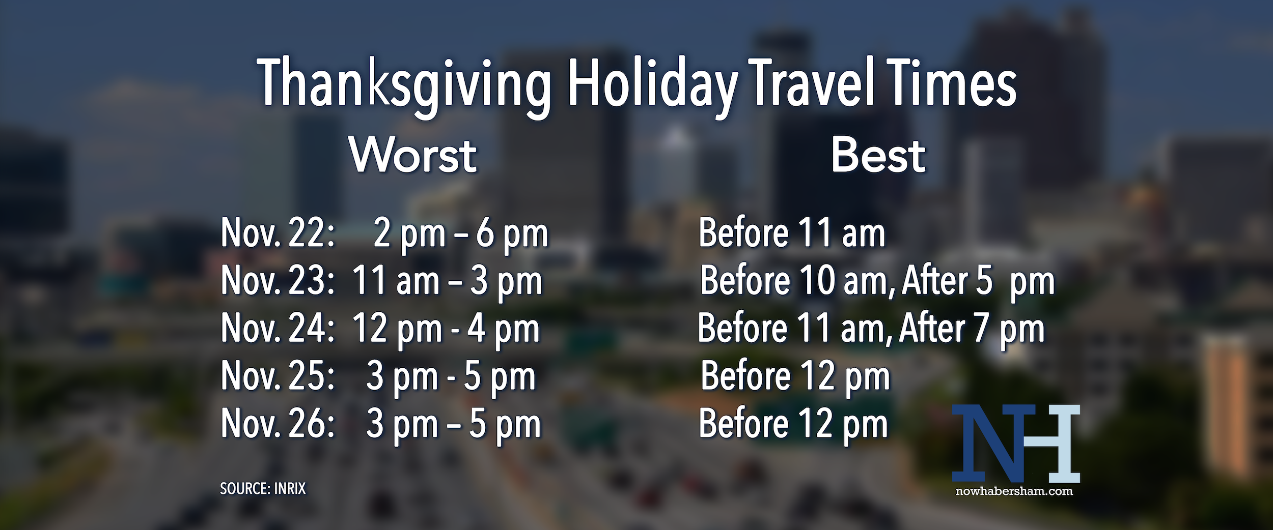 Transportation data analytics company INRIX expects Wednesday, Nov. 22, to be the busiest travel day, with average travel times as high as 80% over normal in some metro areas. INRIX recommends leaving in the morning or after 6 p.m. to avoid the heaviest holiday congestion.