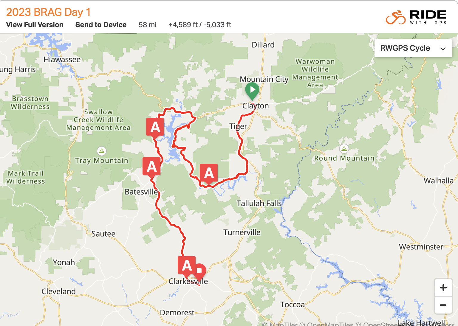BRAG riders will arrive in Clarkesville between 9:30 a.m. and 2 p.m. on June 4. From the Clarkesville square, they’ll travel to Rocky Branch Road, where they’ll cut across Toccoa Highway/Hwy 17 to the Aquatic Center.