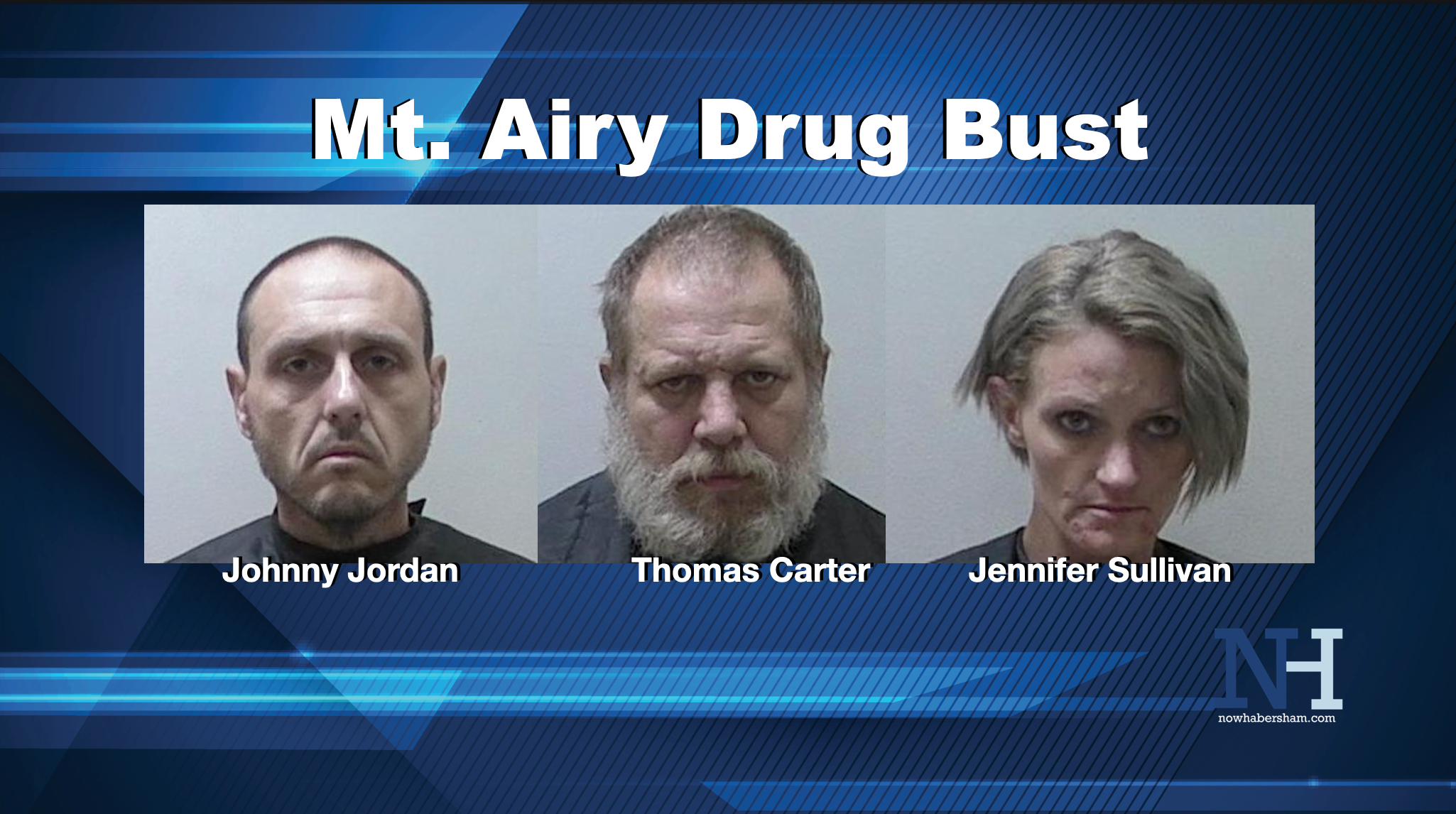 Authorities arrested and charged three Mt. Airy residents this week following a 17-month-long drug trafficking investigation. Johnny Ray Jordan, 42, Thomas Blair Carter, 55, and Jennifer Marie Sullivan, 35, each face multiple charges.