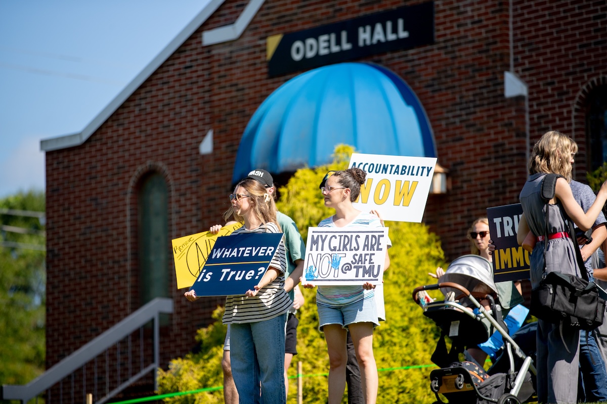 While the students protested outside Odell Hall over the university’s conduct regarding the allegations against Reynolds, the TMU Board of Trustees met inside the building. About 150 yards separated them from the protesters as they arrived for their scheduled meeting. Many trustees ignored the students who stood on the lawn holding signs demanding change at the university. However, a few of the trustees acknowledged the protesters. They turned toward the crowd and waved. The students and alumni waved their signs and cheered in response.