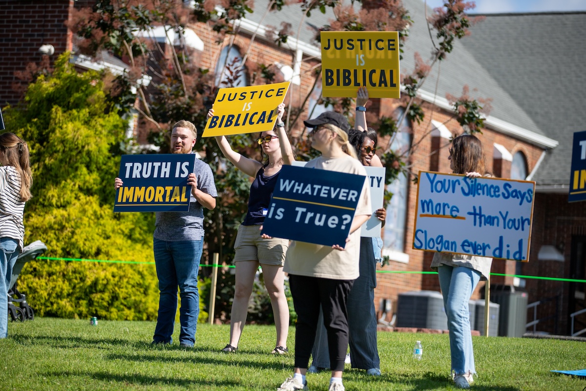 ORIGINAL ARTICLE: A peaceful crowd of some 25 Truett McConnell University students and alumni gathered on the Cleveland campus Friday morning to call for change at the troubled Baptist University.