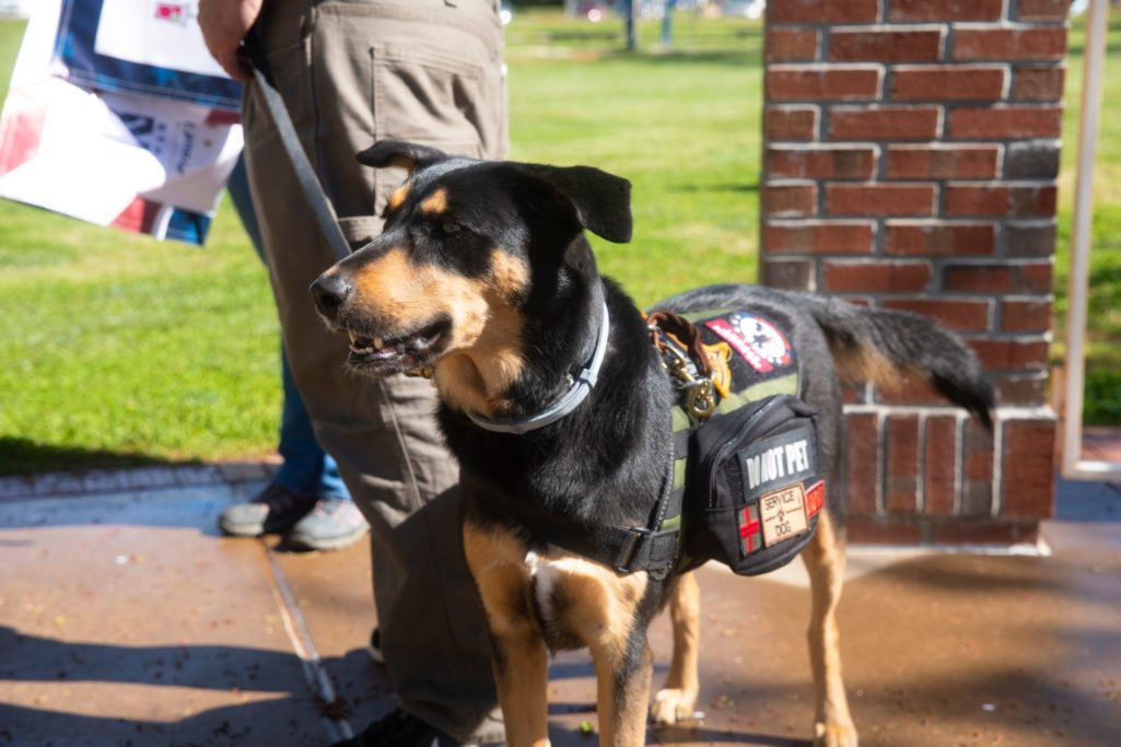 Veteran Eli Patterson’s service dog, Soz, accompanies him to the TMU 5k. (Photo: Truett McConnell University)