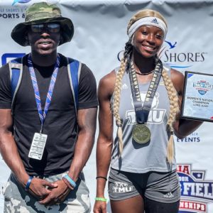 Hall pictured with Track and Field teammate, Jabari Williams at the National Tournament at Gulf Shores, Alabama, May 25-27, 2022. (TMU Athletics photo)