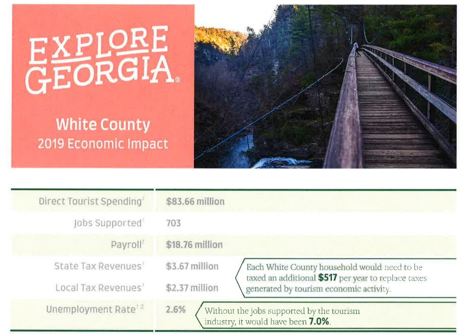 The study, made available through Explore Georgia, the tourism division within the Georgia Department of Economic Development, reported travel and tourism created $3.67 million in state tax revenues and generated $2.37 million in local tax revenues for White County and its cities in 2019.