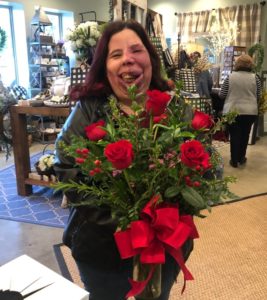 The burst of love and happiness started yesterday when we called to confirm that she and her husband, Randy, were winners. This afternoon, Stephanie, was greeted by a beautiful arrangement of roses from Blue Willow Floral.