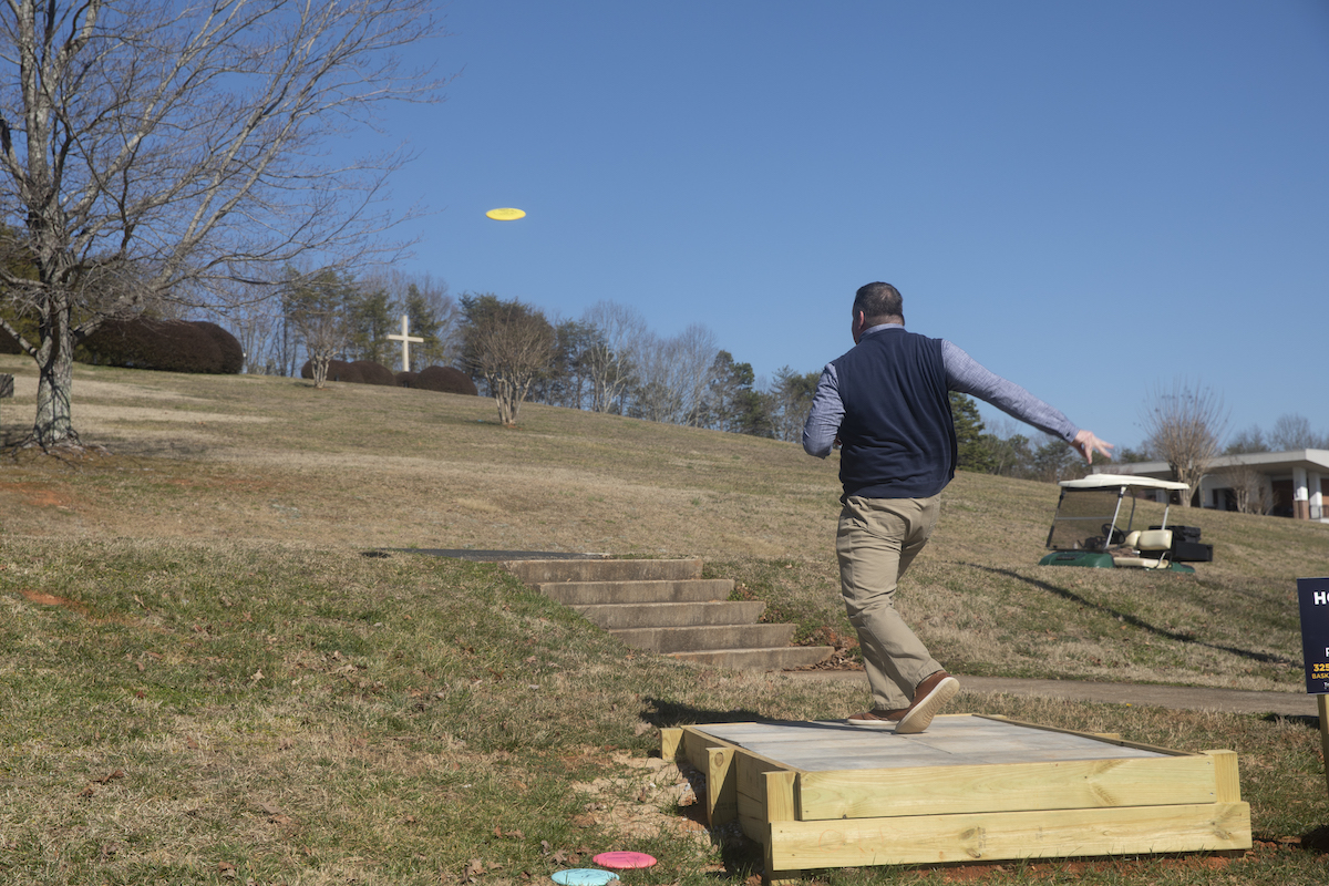 Avery Dowdle, a TMU sophomore who envisioned and created the course, said, “I live right outside of Charlotte, North Carolina, which is a large hub for the disc golf community. Coming to north Georgia from a place with dozens of courses, I wanted to bring my passion for the sport with me. The nearest course that I could find was a bit of a drive, so finding time to go play while juggling assignments was difficult. I pitched the idea to TMU to build a course on campus, not just for my enjoyment, but so that students and the community would have something new and exciting to experience!”