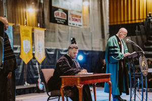 Following the public signing, Dr. David Drake, Director of Alumni and Church Relations, addressed the crowd by recognizing alumni who graduated from Truett McConnell in the late forties through 2020. Many graduates stood as each decade was announced, including “pioneer” Virgil “Junior” Hunt from the class of 1949.