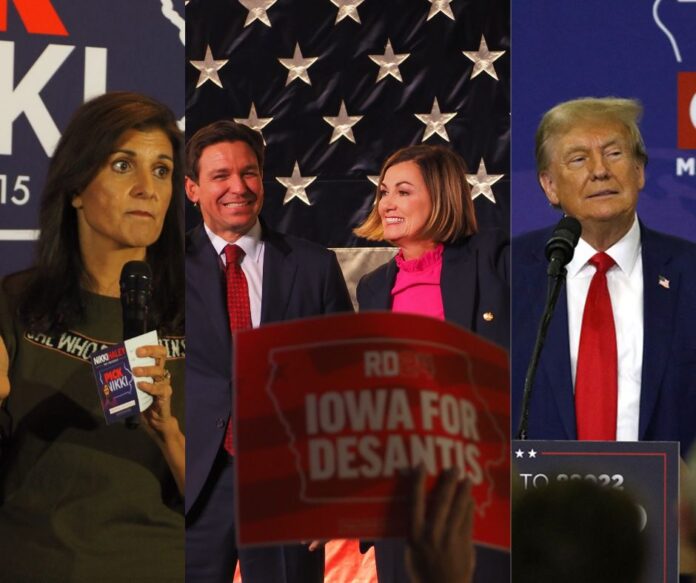 Trump entered the first-in-the-nation nominating contest with a historic lead in the most recent Iowa Poll by The Des Moines Register/NBC News/Mediacom — leading at 48%, with Haley at 20% and DeSantis trailing at 16%.