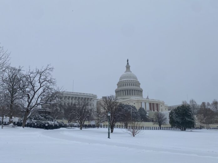 The U.S. Capitol under a blanket of snow on Jan. 6, 2025. (Jennifer Shutt/States Newsroom)