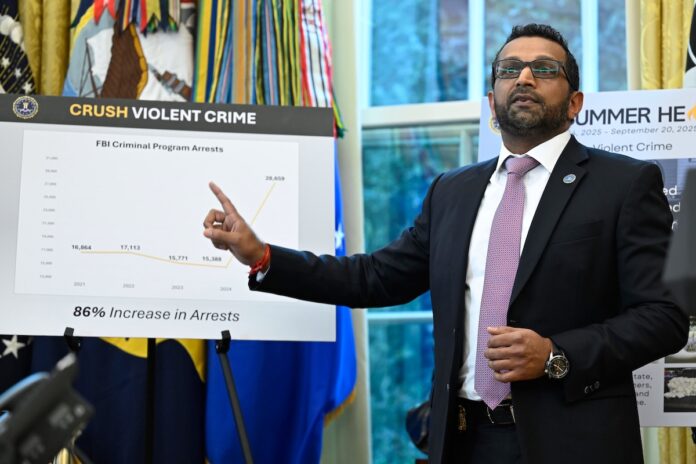 FBI Director Kash Patel speaks during an event with President Donald Trump in the Oval Office at the White House, Wednesday, Oct. 15, 2025, in Washington. (AP Photo/John McDonnell)