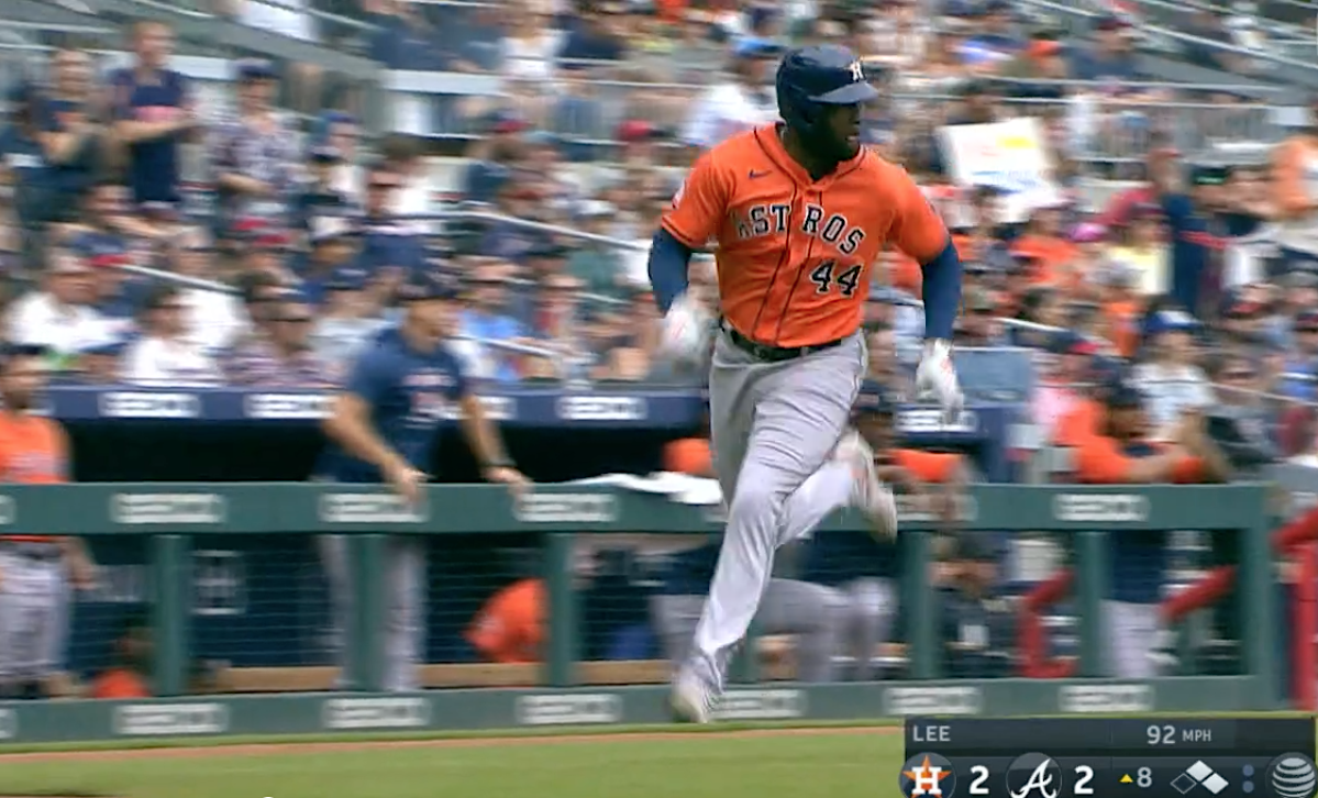Yordan Alvarez brings in the go ahead run on a single by Kyle Tucker in the top of the 8th Sunday at Truist Park. (livestream capture MLB)