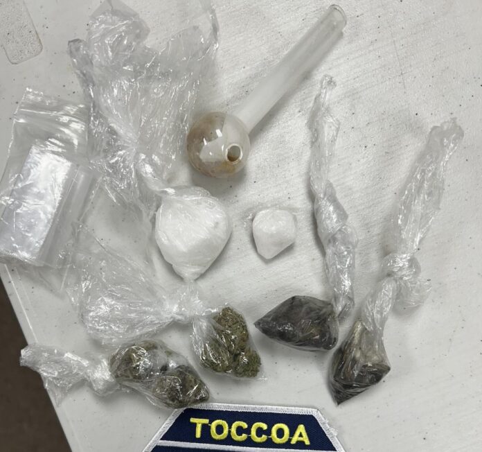 According to the Toccoa Police Department, officers conducted the stop on a black 2014 Ford Fusion occupied by Gabriel Montrell McCurry and Angela Marie Simpson in Toccoa. During a roadside investigation, authorities allegedly discovered various offenses leading to their arrests.