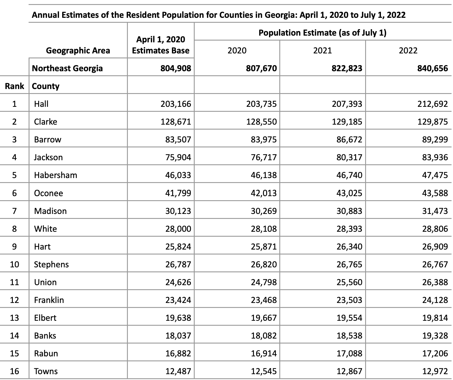 In Northeast Georgia, Hall County’s population reached 212,692 last year, making it the 10th most populous county in Georgia. Clarke County had the second-highest population in the region at 129,875.