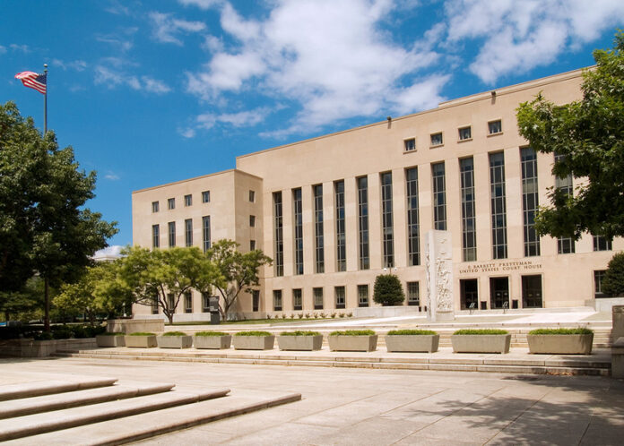 A three-judge panel of the U.S. Court of Appeals for the District of Columbia Circuit heard arguments at the E. Barrett Prettyman Federal Courthouse on March 24, 2025, over a challenge of a lower court’s restraining order barring the administration from deporting Venezuelan immigrants under a wartime law. (U.S. General Services Administration photo)