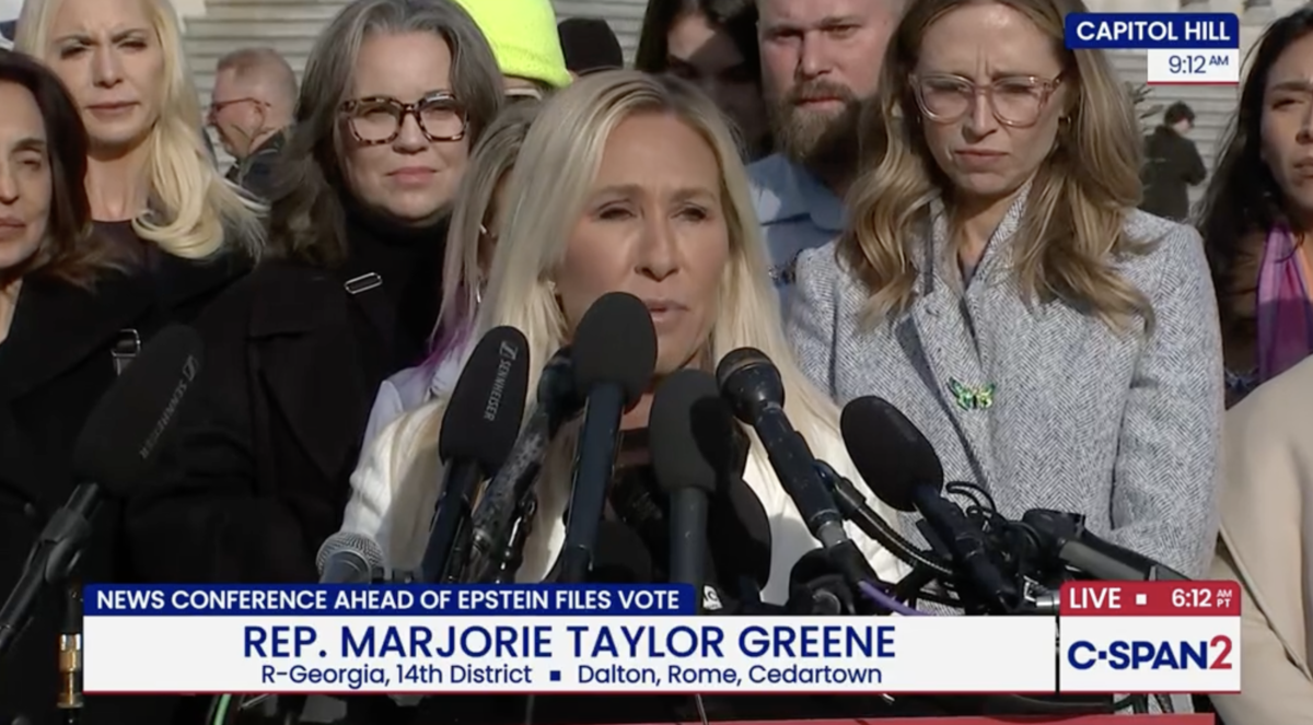 “The only thing that will speak to the powerful, courageous women behind me is when action is actually taken to release these files, and the American people won’t tolerate any other b- – – -t,” Greene said.