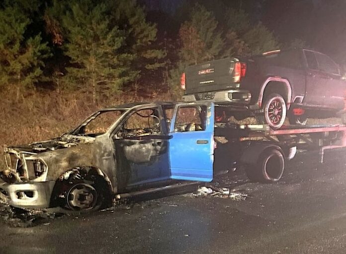The fire was mostly contained to the pickup, but one of the vehicles on the trailer was also damaged.