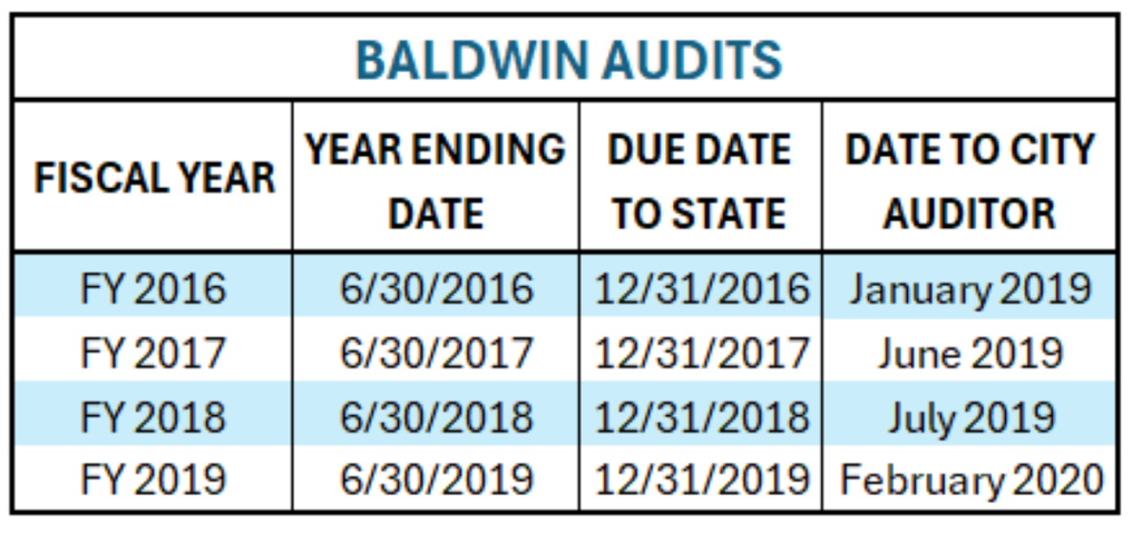 The city was behind only two audits when she took office, FY 2016 and FY 2017. Her first year in office, the city fell behind with FY 2018. However, in 2019, all three audits were completed and submitted to the State Auditor’s Office.
