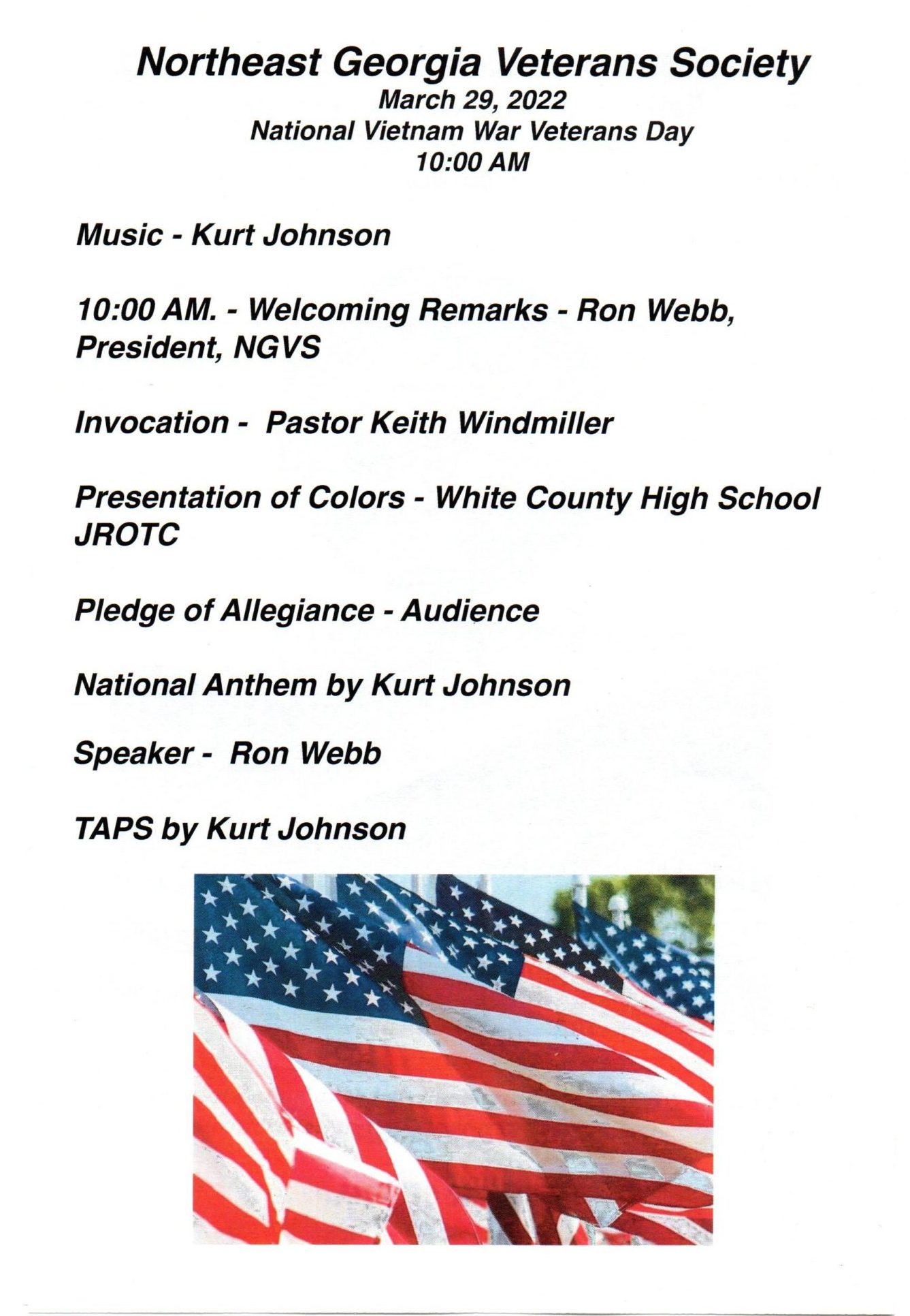 The Northeast Georgia Veterans Society will hold a ceremony honoring Vietnam veterans this Tuesday at Freedom Park in Cleveland.