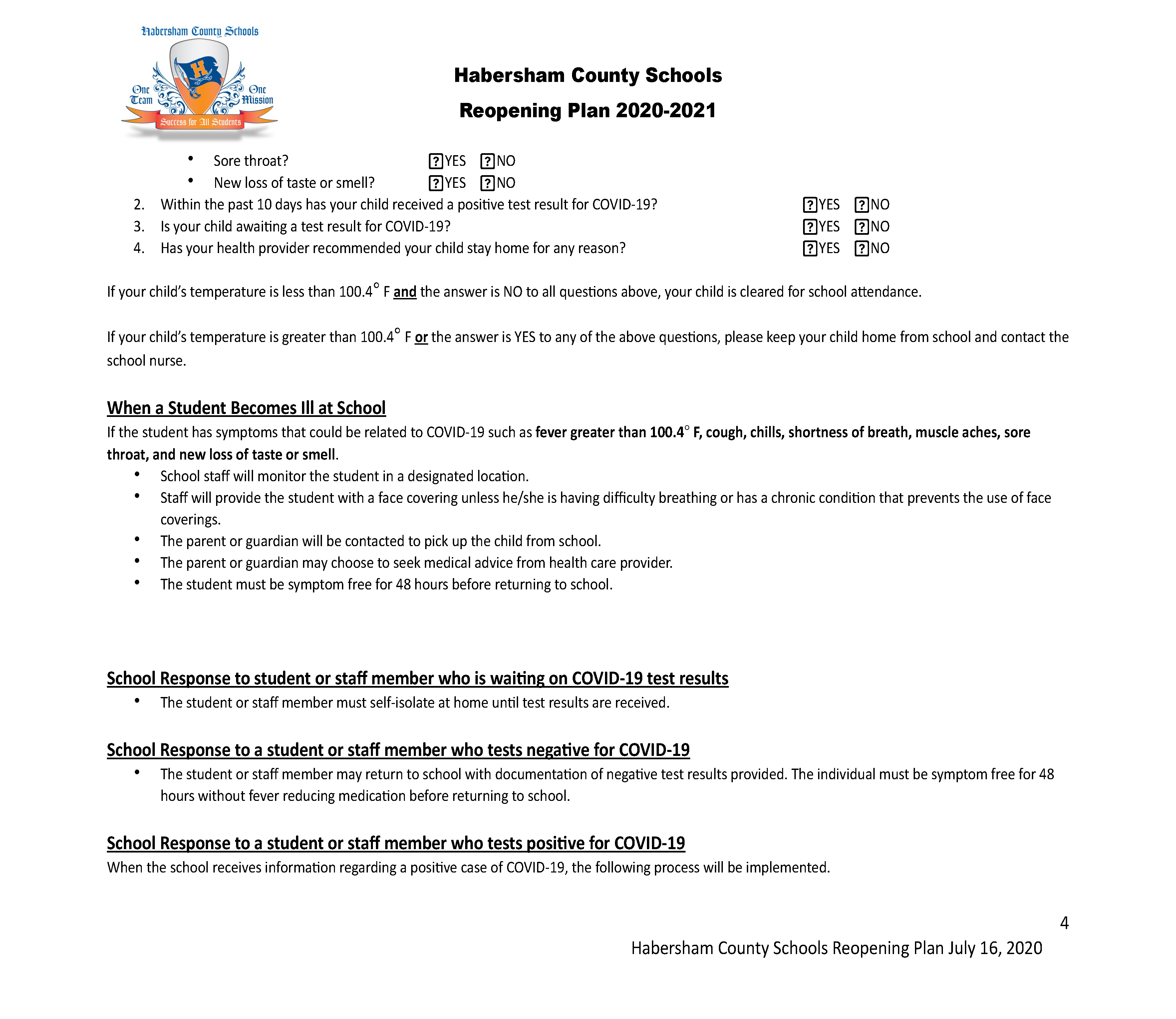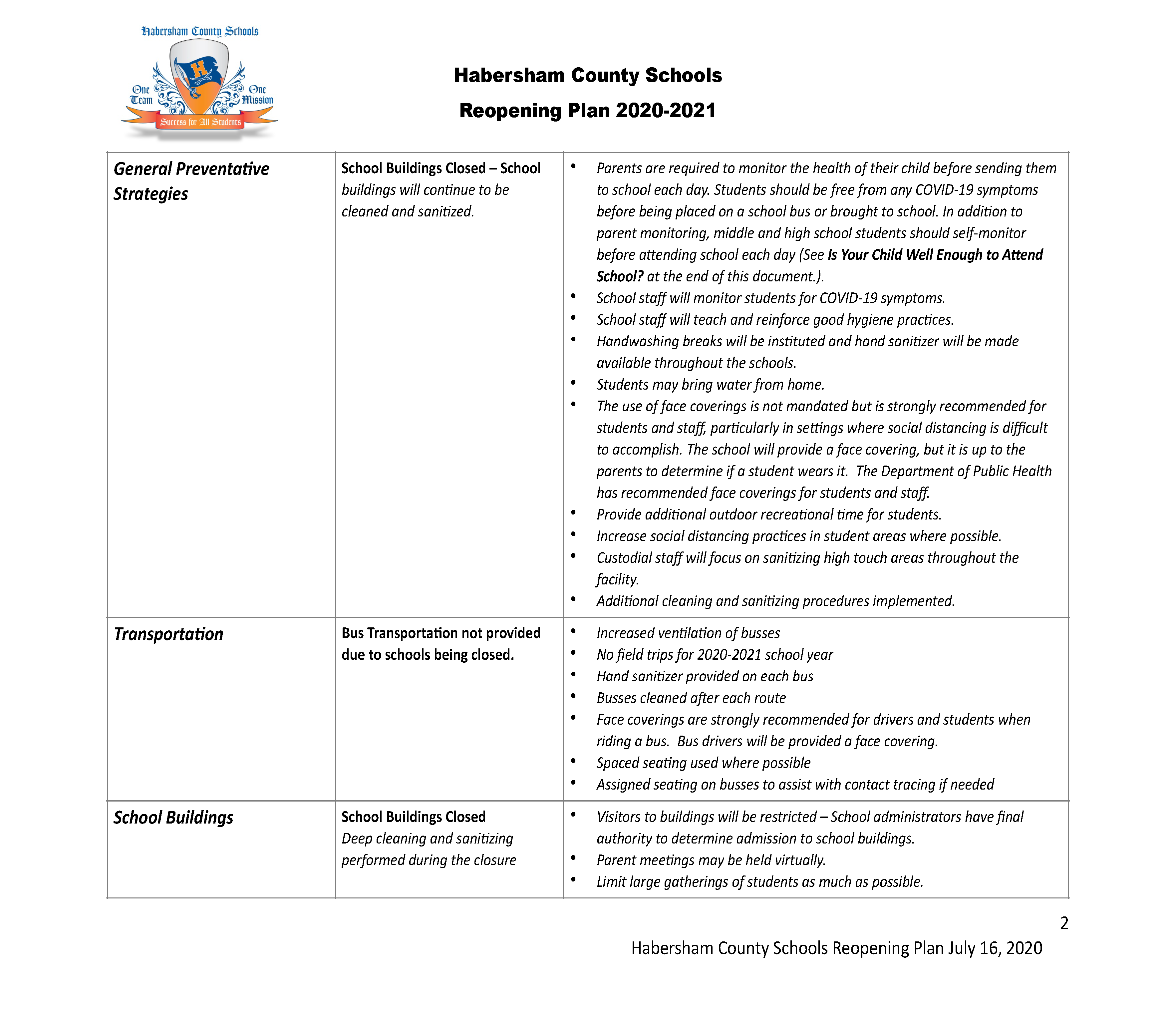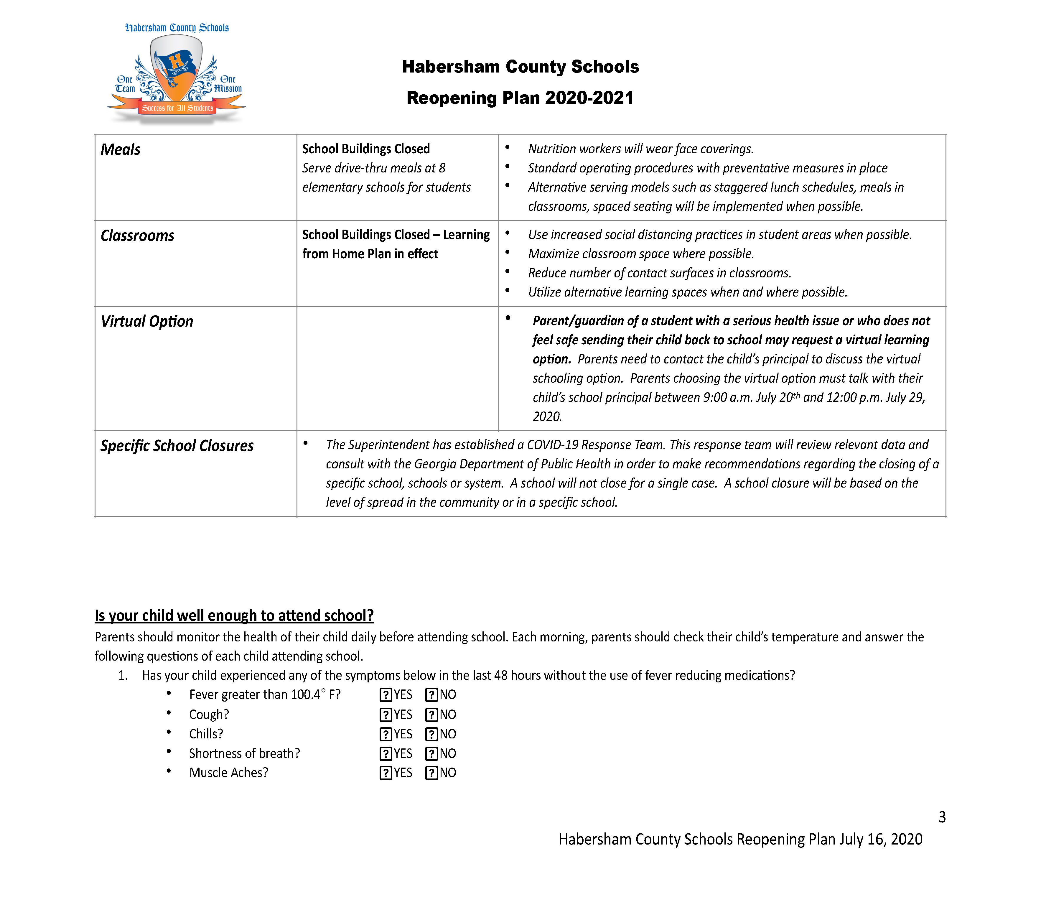 The plan lays out how the school system plans to safely reopen schools and provides guidance for schools on how to prevent and respond to COVID-19. The plan also provides guidance to parents on whether or not their child is well enough to attend school and the role parents play in helping prevent the spread of COVID-19.