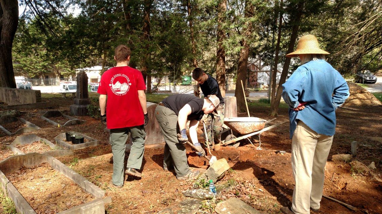 Members of Boy Scout Troop No. 5 in Clarkesville work on landscaping projects at the Old Clarkesville Cemetery on March 23. Shown, from left, are Joseph McNair, Kevin Bayles, Patrick McNair, and Historic Clarkesville Cemetery Preservation board member, Polly Earle.