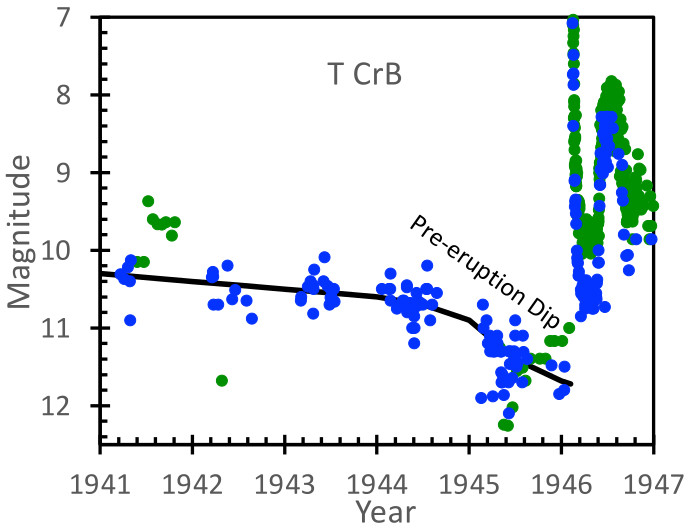 Aside from the previous sightings all roughly 80 years apart, there is one other thing we can track to help predict the upcoming nova: T CrB’s brightness. Prior to the 1946 event, astronomers were closely tracking the system’s brightness in anticipation of any potential changes. What they witnessed was a mysterious dimming of the star system immediately before the white dwarf went nova. This “pre-eruption dip” has no known cause, but is likely due to dust getting in our line of sight to the star system somehow. The graph below shows what they witnessed from 1941-1947. You can see the dip then brilliant spike afterwards.